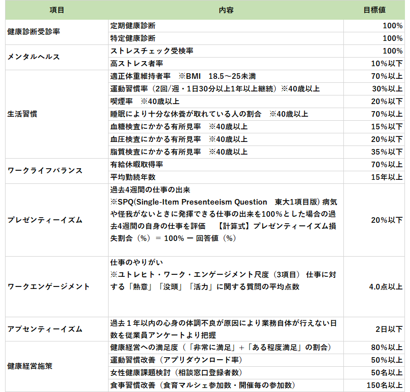健康経営を進めることで、従業員の心身の健康状態の改善を図っていきます。今後、40代以上~65歳以下の従業員が増加する見込みでおり、生活習慣病に罹患するリスクが高まることが想定されます。年齢を重ねても健康で活躍できる会社を目指し、生活習慣病や様々の病気のリスク低減させるべく、目標指標を定め活動しています。