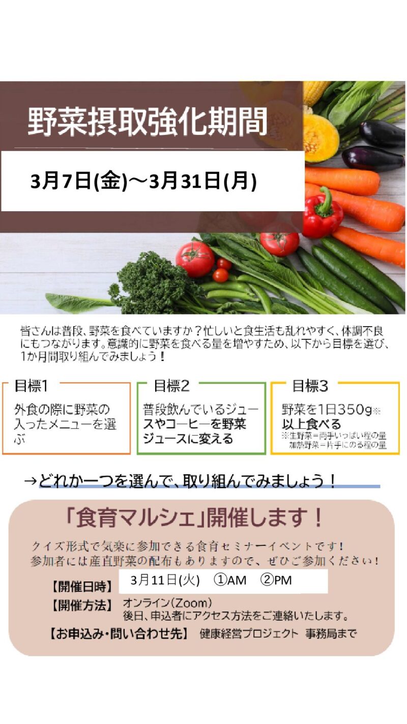 活動内容:社員の食事習慣改善のため、減塩や野菜摂取を促進する取り組みを行っており、 参加した社員へ旬の野菜を配布する食育マルシェでは、社員から好評をいただいております。 実績:2022年度 野菜強化月間 開催(2回) 食育マルシェ 開催(2回) 合計参加者170名突破 活動予定:野菜強化月間 開催予定(年3回) ベジチェック 実施予定(年2回) 食育マルシェ 開催予定(年3回) ◆イベント開催状況 2025年3月11日:食育マルシェ「テーマ:レタス」開催 112名参加 2025年6月23日:食育マルシェ「テーマ:アスパラガス」開催 138名参加